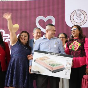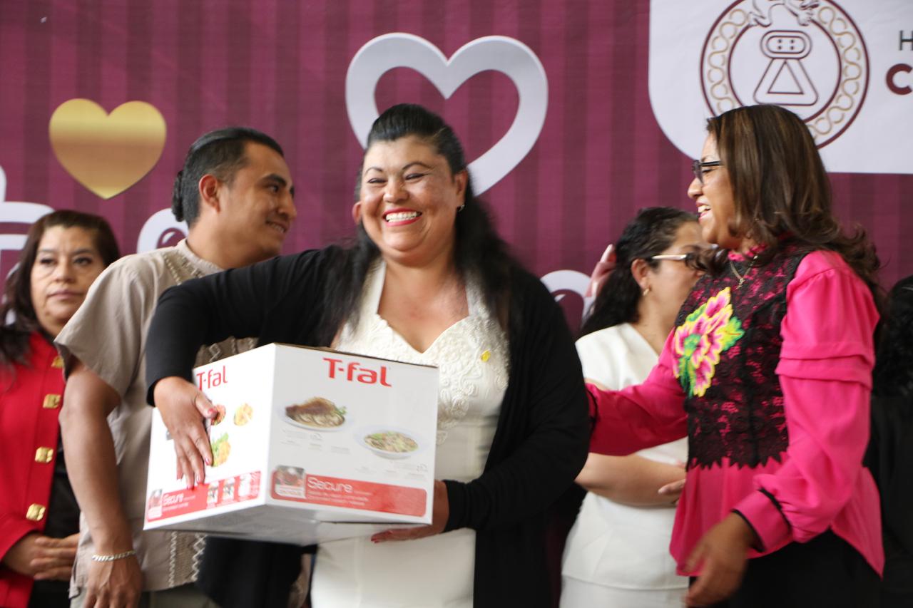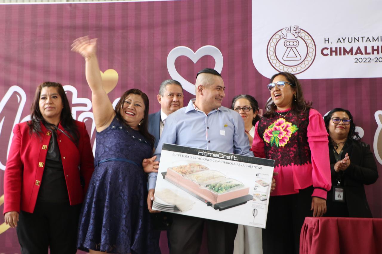 Las 320 parejas, que se dieron el “sí” frente a la autoridad del Registro Civil del Estado de México, Rossana Hermosillo Plascencia, recibieron boletos para participar en la rifa de mobiliario y artículos como recámaras, refractarios, lavadoras, juegos de sartenes, vajillas, bufeteras, una olla exprés, un horno tostador, una pantalla de 50 pulgadas, un refrigerador, entre otros.