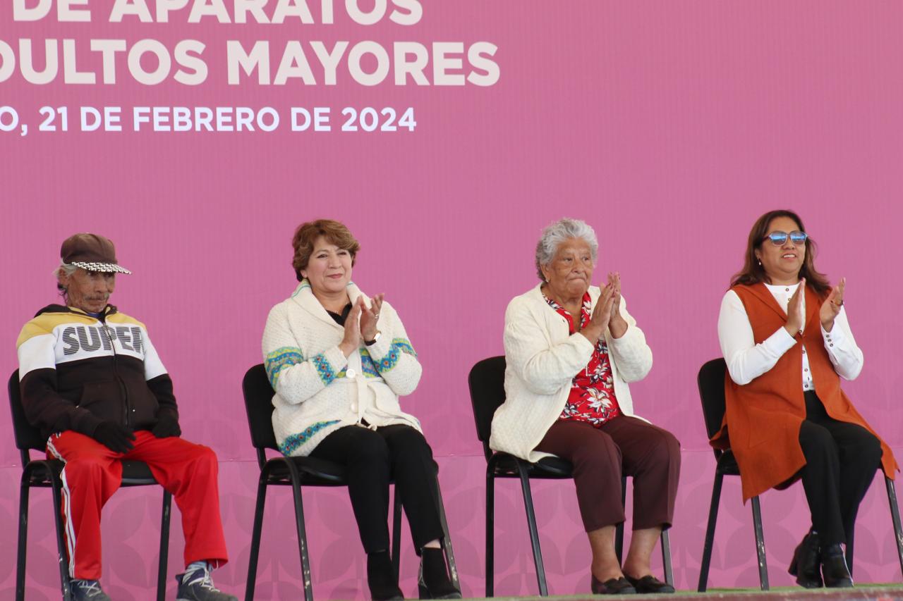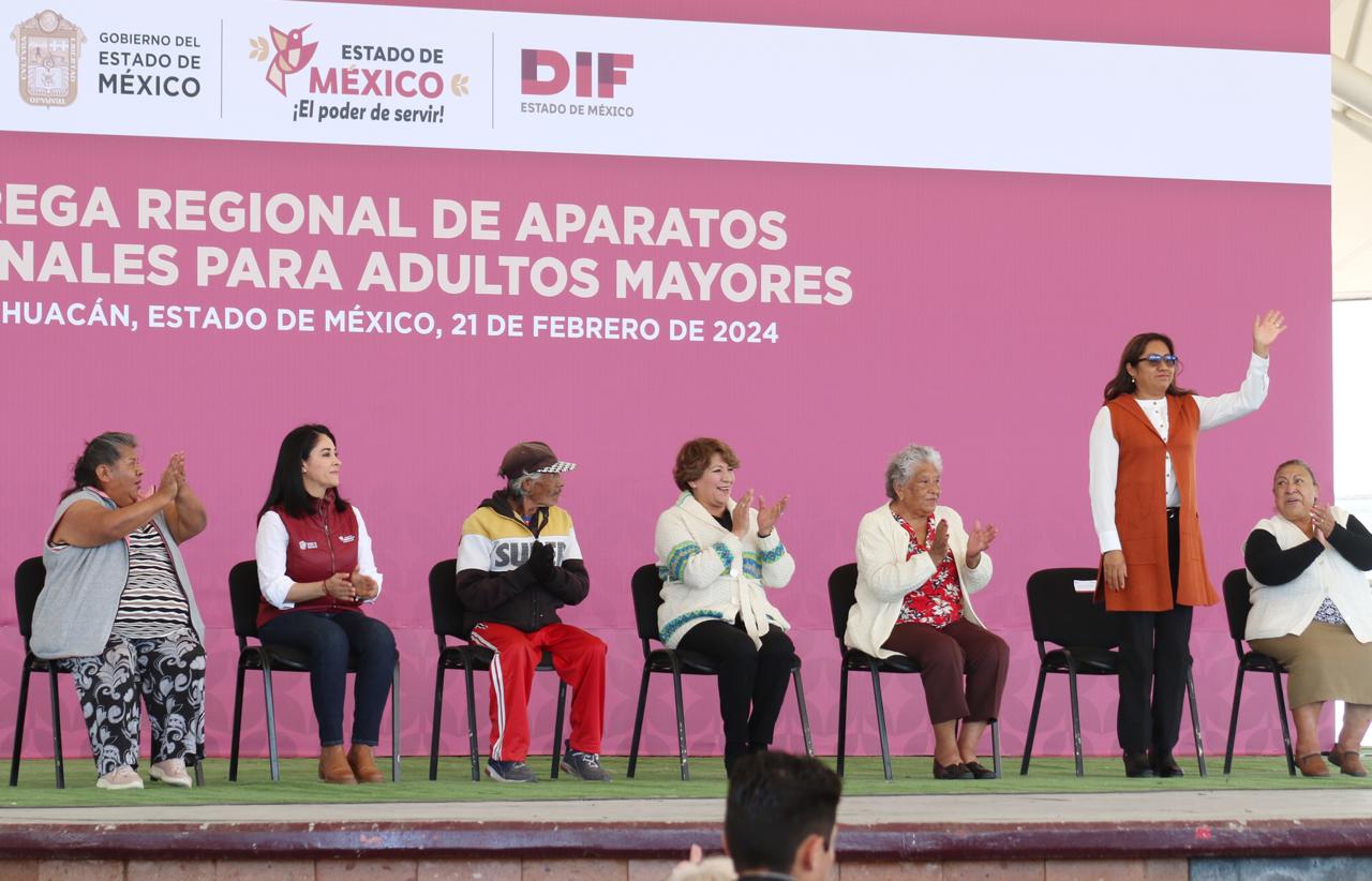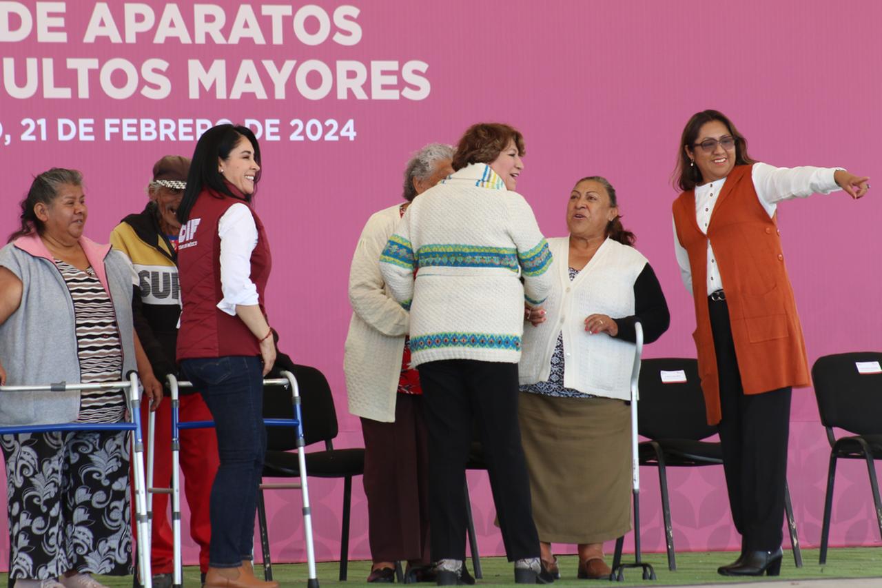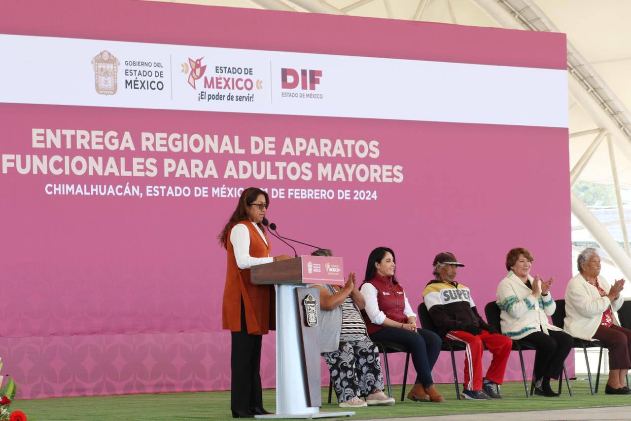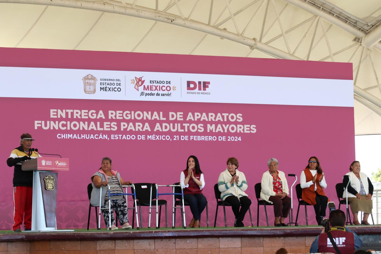 En compañía de la Presidenta Municipal de Chimalhuacán, Xóchitl Flores Jiménez, y de la Directora General del Sistema Estatal para el Desarrollo Integral de la Familia del Estado de México (DIFEM), Karina Labastida Sotelo, la Gobernadora Delfina Gómez Álvarez entregó 919 aparatos funcionales a adultos mayores de 25 municipios del Estado, en el Recinto Ferial de la localidad. El objetivo de la entrega de aparatos, dijo la Gobernadora, es apoyar y facilitar a los adultos mayores el acceso a una mejor calidad de vida, pues conforman una población que no solo necesita un aparato o recursos, sino que también requiere atención, visibilización y respeto.