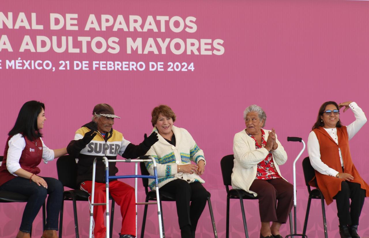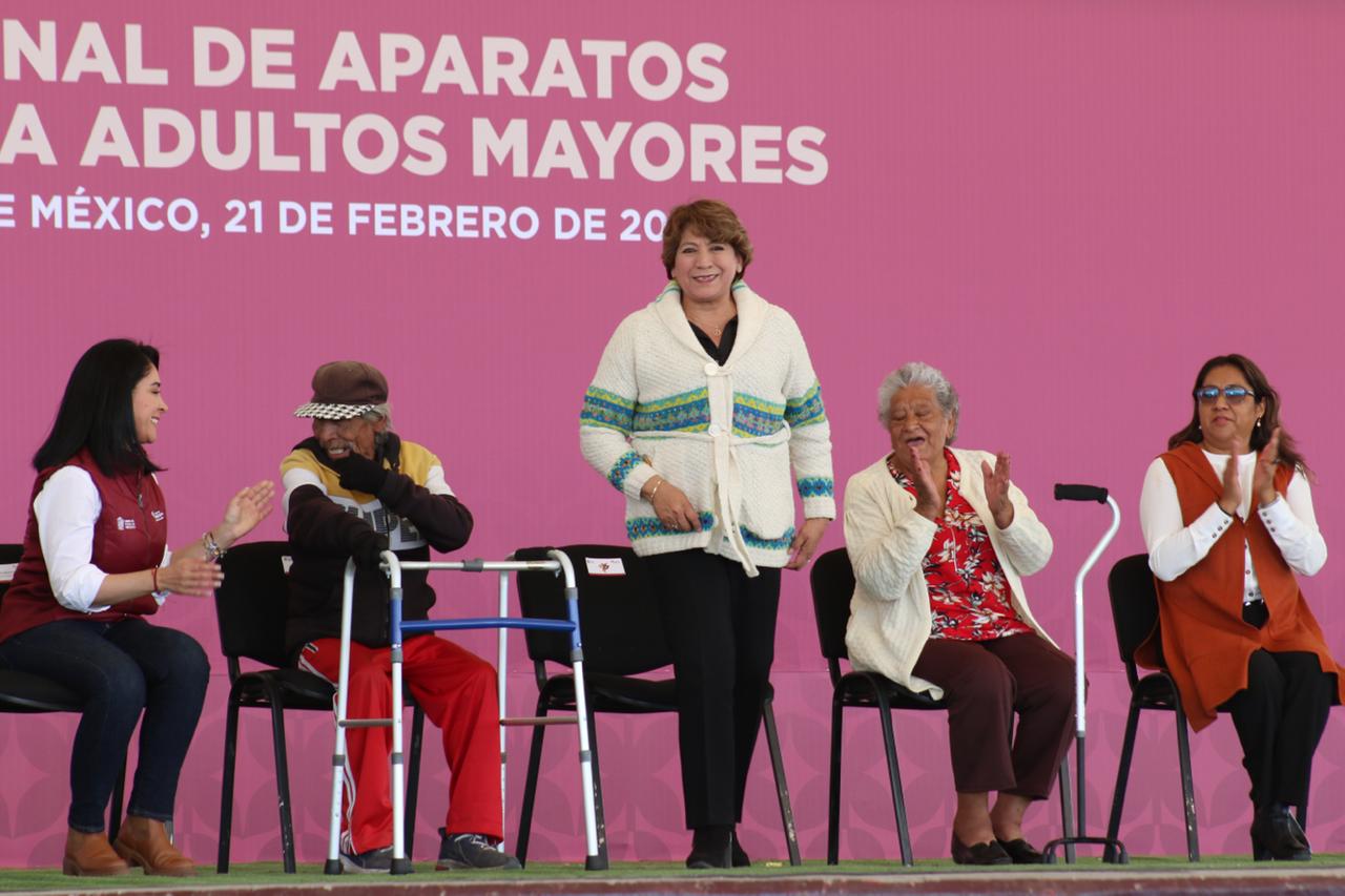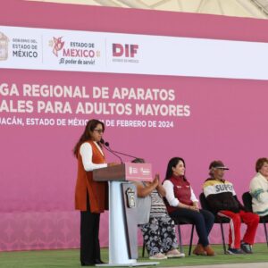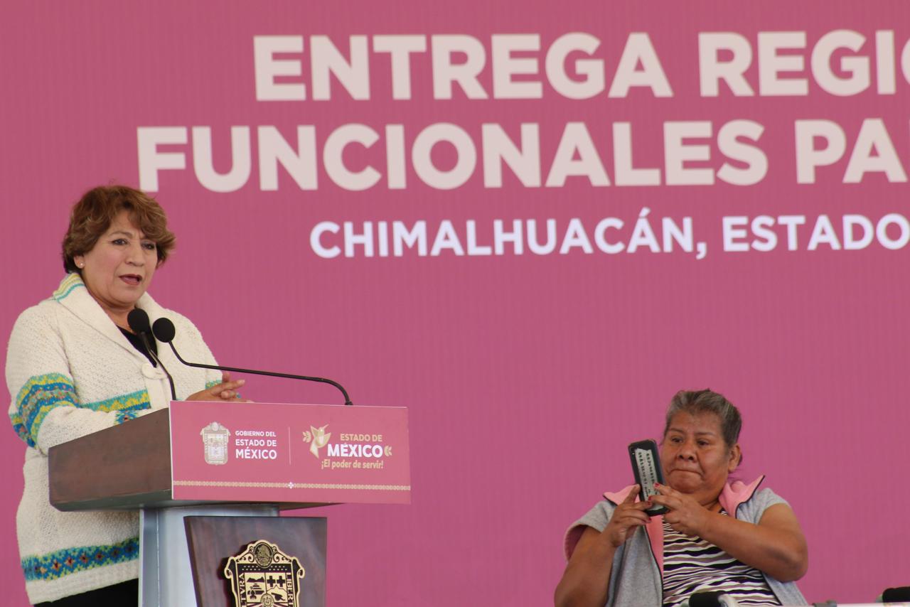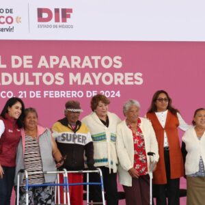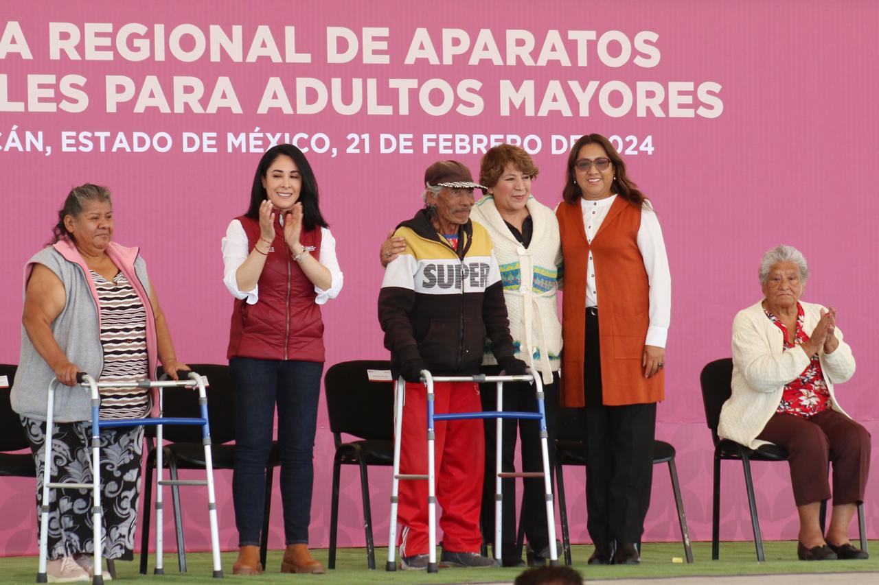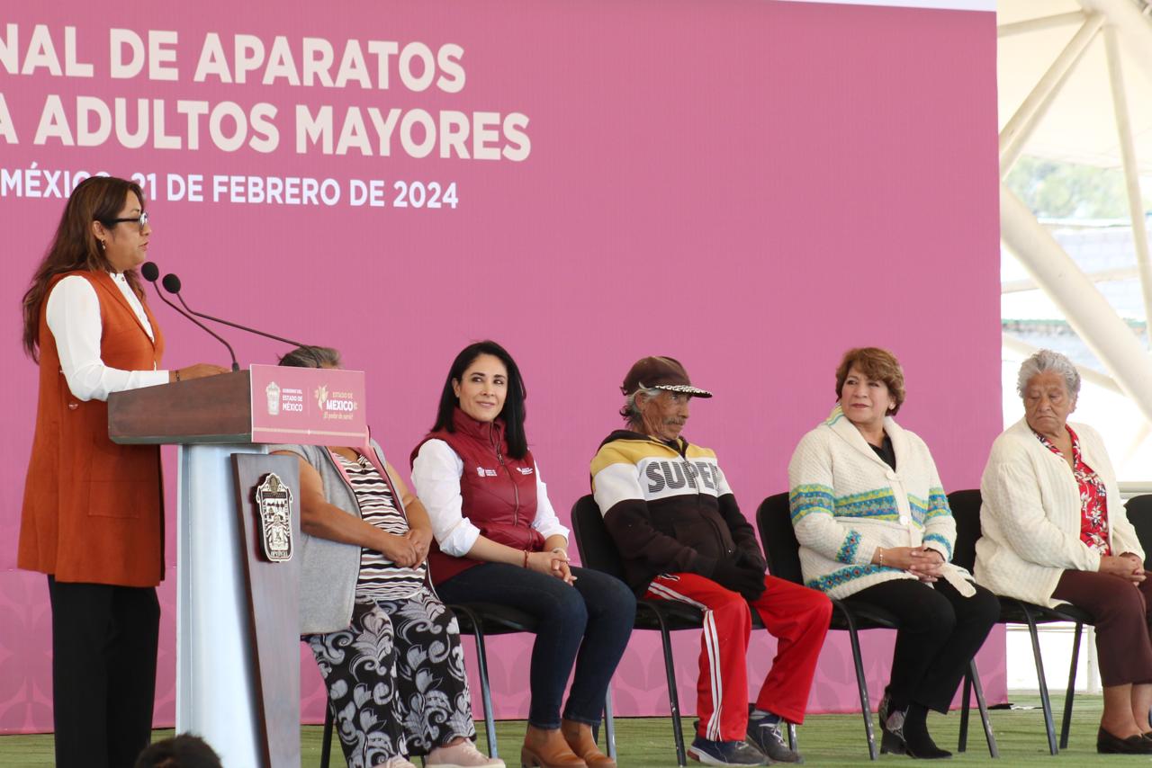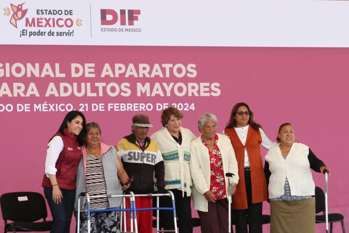 En compañía de la Presidenta Municipal de Chimalhuacán, Xóchitl Flores Jiménez, y de la Directora General del Sistema Estatal para el Desarrollo Integral de la Familia del Estado de México (DIFEM), Karina Labastida Sotelo, la Gobernadora Delfina Gómez Álvarez entregó 919 aparatos funcionales a adultos mayores de 25 municipios del Estado, en el Recinto Ferial de la localidad. El objetivo de la entrega de aparatos, dijo la Gobernadora, es apoyar y facilitar a los adultos mayores el acceso a una mejor calidad de vida, pues conforman una población que no solo necesita un aparato o recursos, sino que también requiere atención, visibilización y respeto.