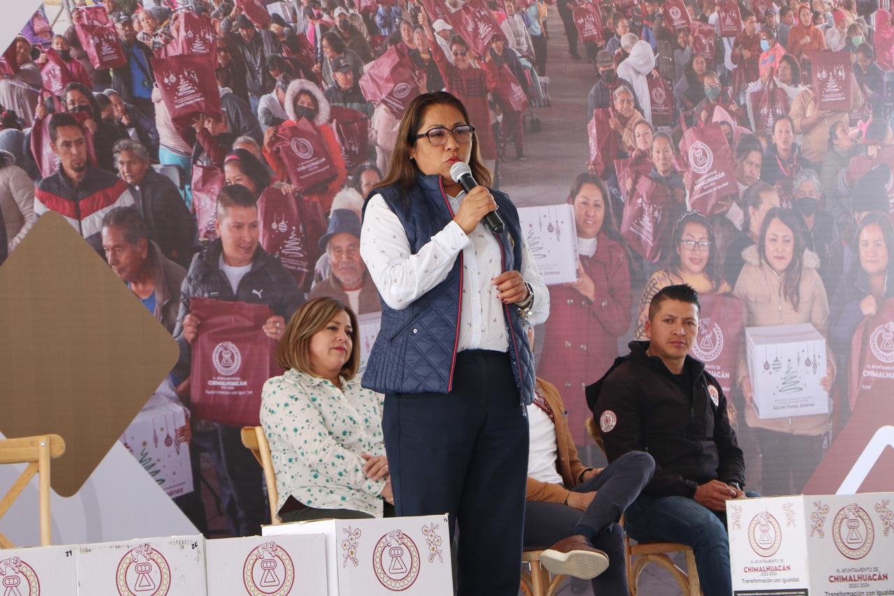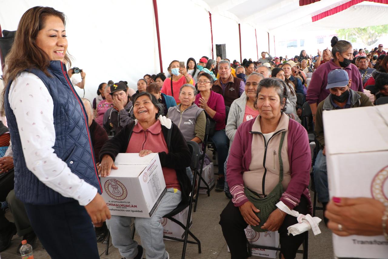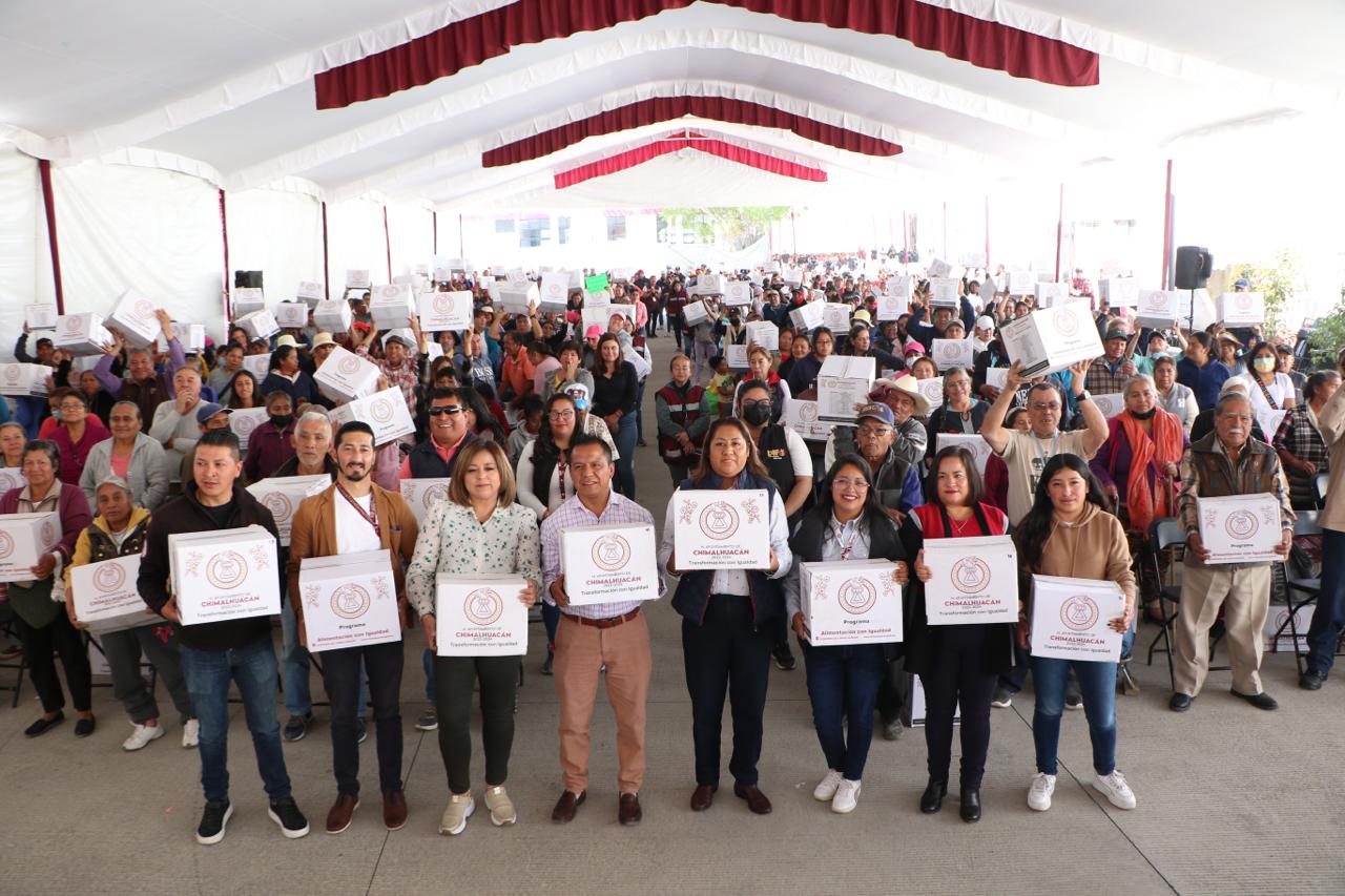 Ante miles de vecinos del Ejido de Santa María Chimalhuacán, la Presidenta Municipal, Xóchitl Flores Jiménez, inició la primera entrega del año de canastas básicas del programa municipal “Alimentación con Igualdad”, implementado por primera vez en su administración en el 2022. El objetivo del programa es contribuir a que las familias vulnerables tengan acceso a una alimentación de calidad.