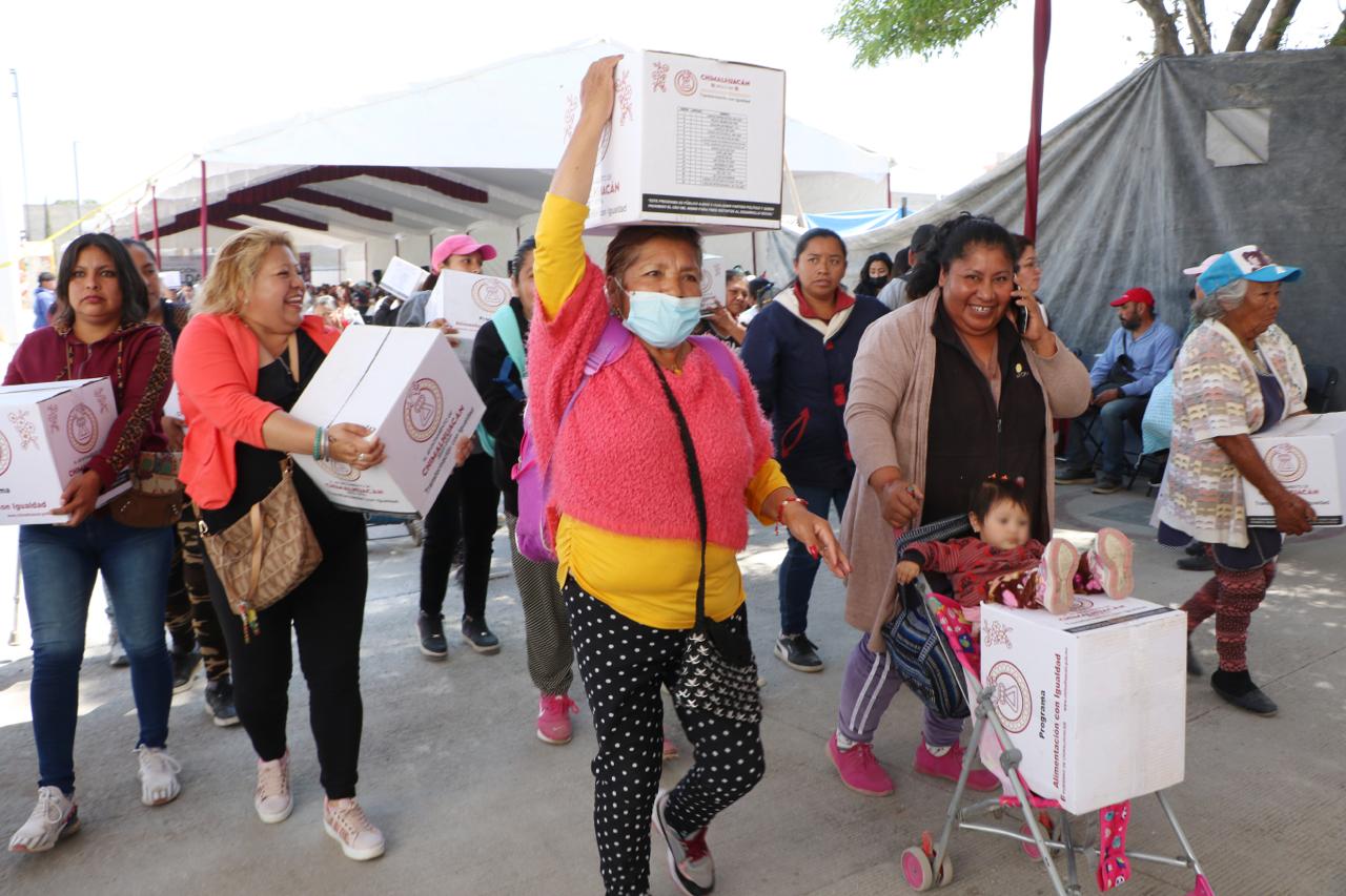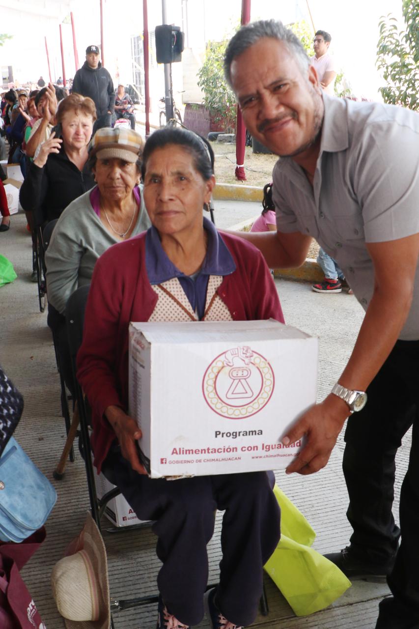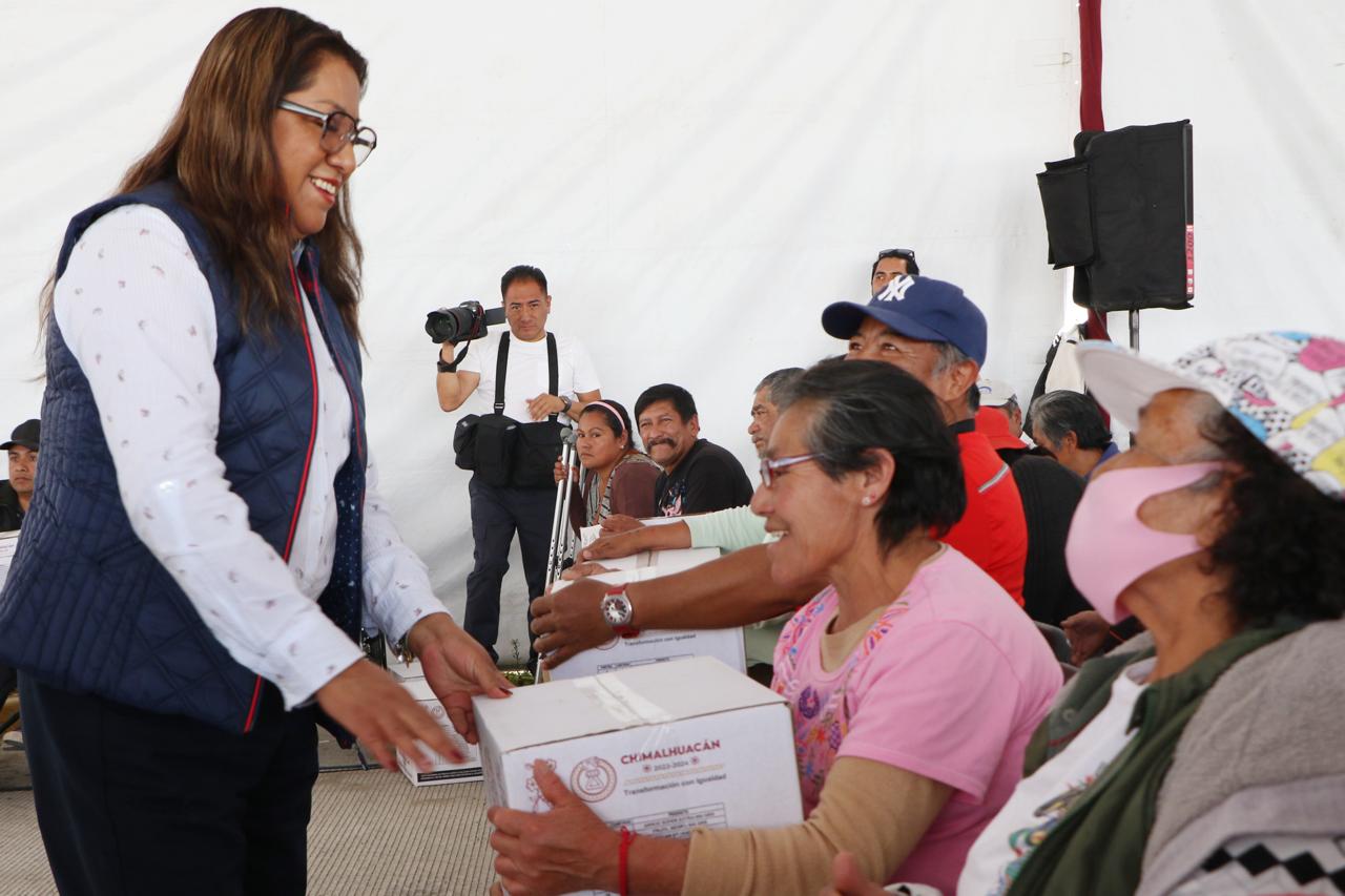 Ante miles de vecinos del Ejido de Santa María Chimalhuacán, la Presidenta Municipal, Xóchitl Flores Jiménez, inició la primera entrega del año de canastas básicas del programa municipal “Alimentación con Igualdad”, implementado por primera vez en su administración en el 2022. El objetivo del programa es contribuir a que las familias vulnerables tengan acceso a una alimentación de calidad.