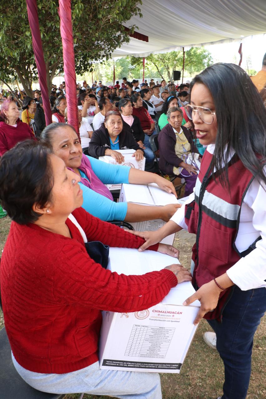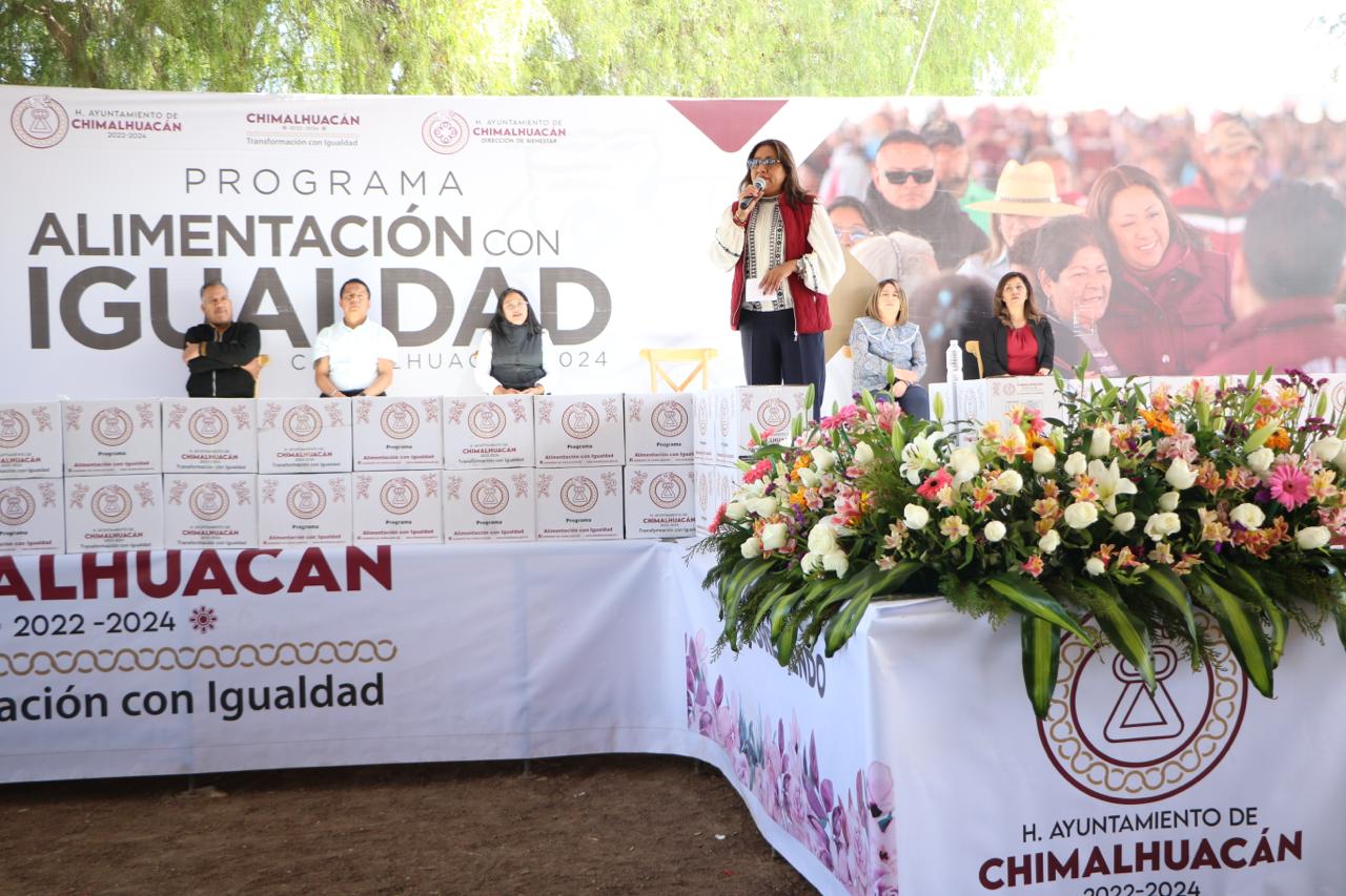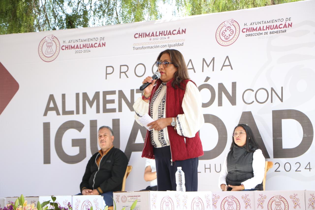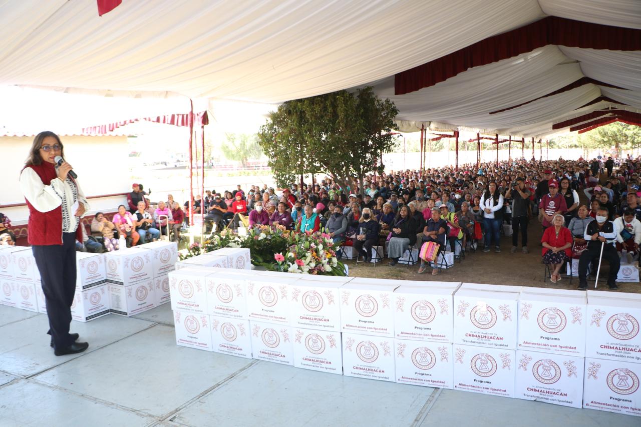 Al entregar 3 mil 46 canastas alimentarias a vecinos de 24 comunidades del municipio que se dieron cita en las instalaciones del Parque Ecoturístico “El Chimalhuache”, la Presidenta de Chimalhuacán, Xóchitl Flores Jiménez, expresó que este año su administración realizará más obras, servicios y programas en beneficio de la población chimalhuaquense.
