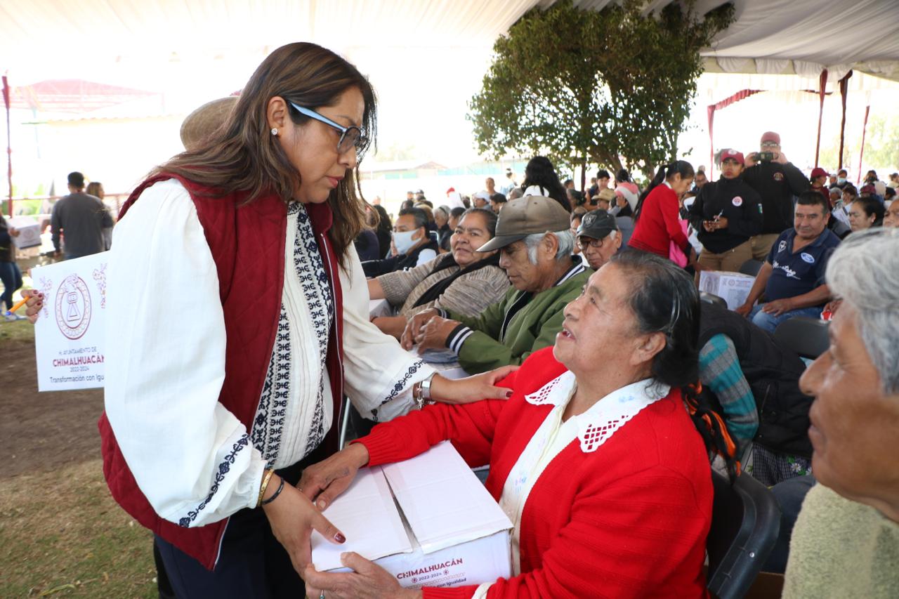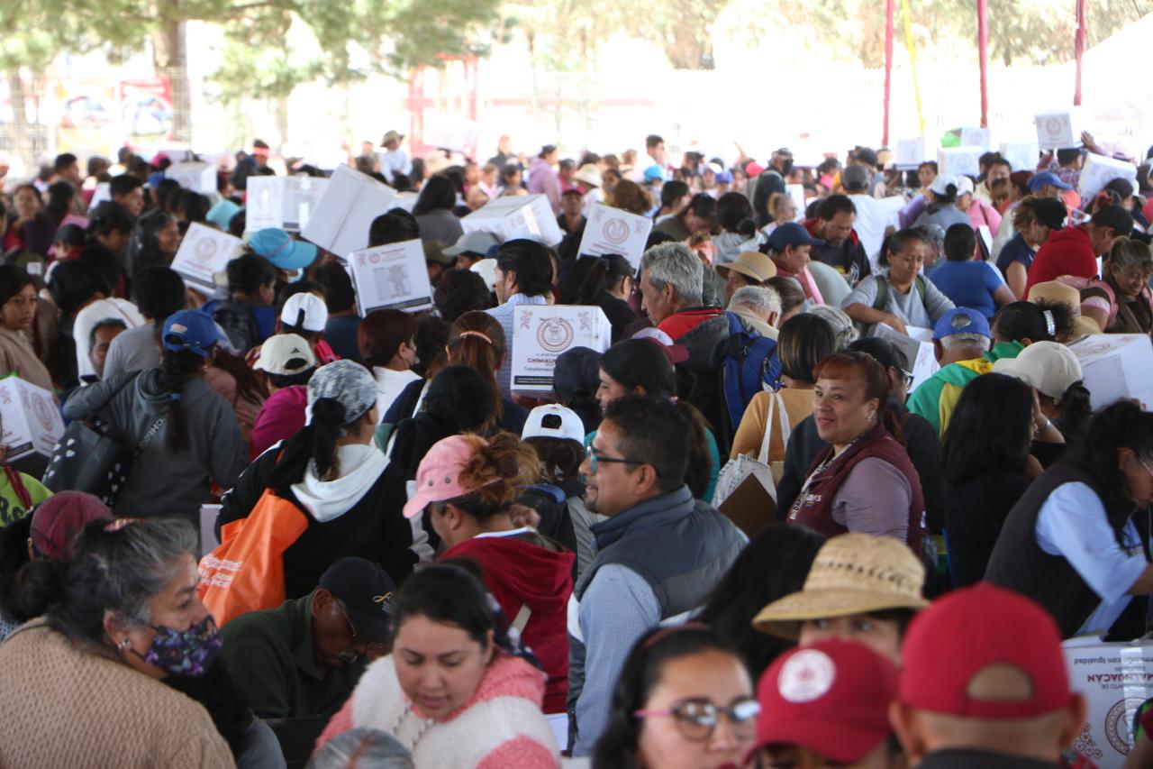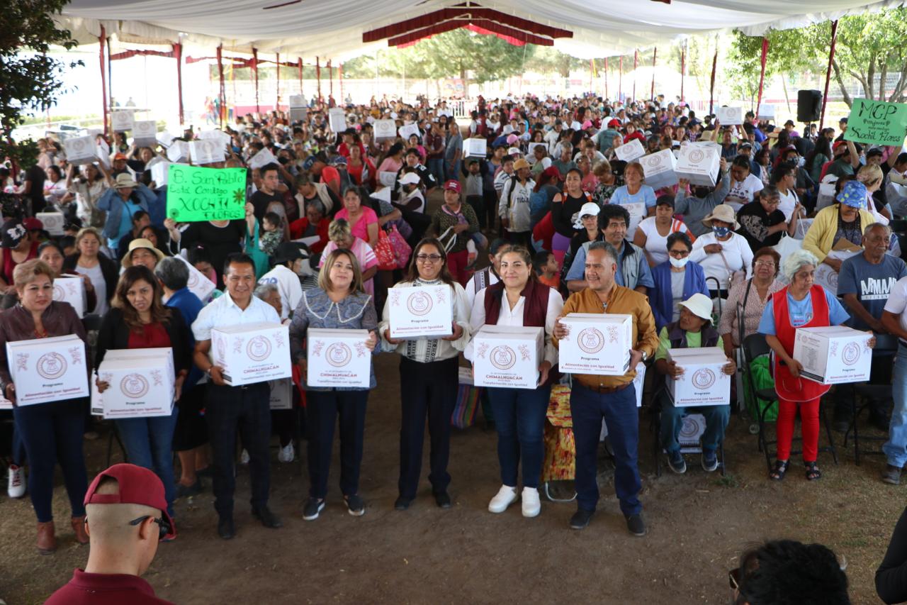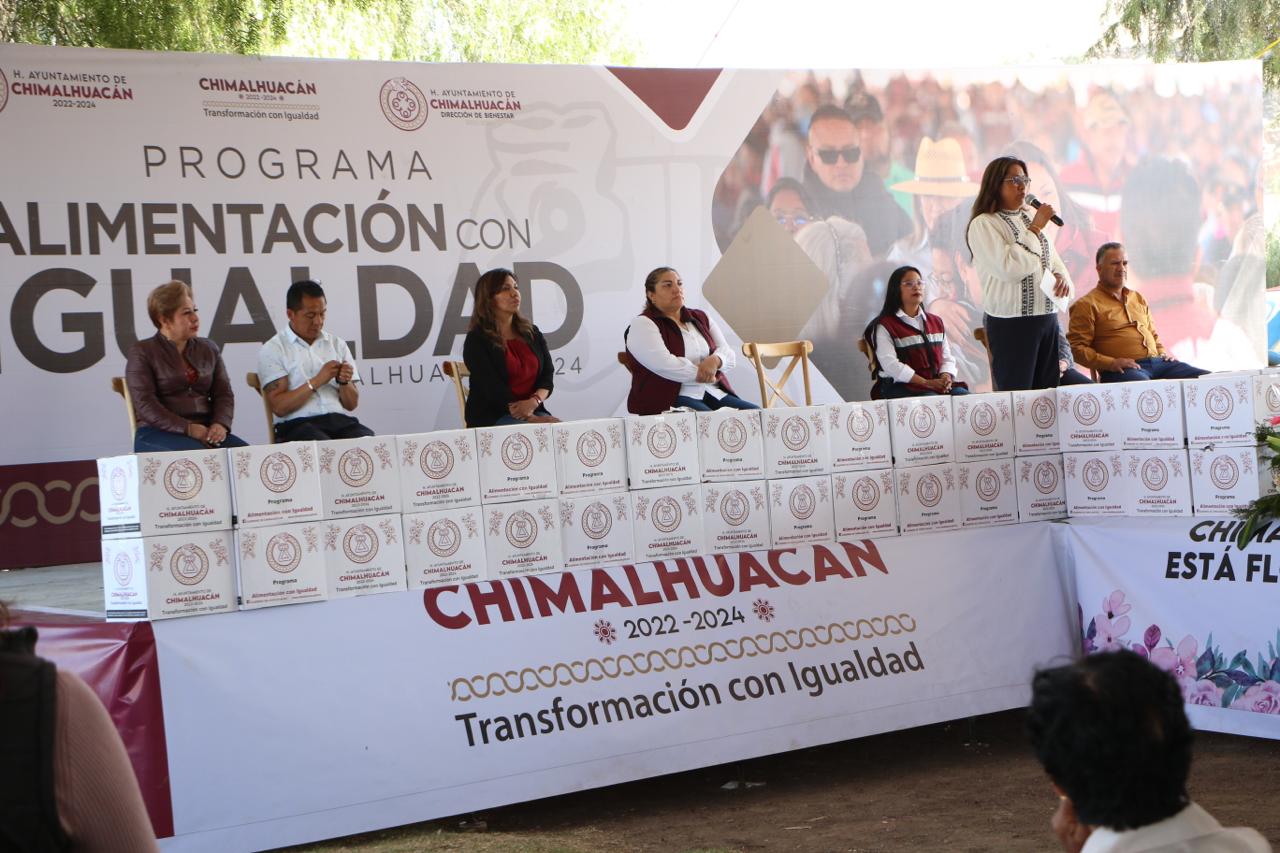 Al entregar 3 mil 46 canastas alimentarias a vecinos de 24 comunidades del municipio que se dieron cita en las instalaciones del Parque Ecoturístico “El Chimalhuache”, la Presidenta de Chimalhuacán, Xóchitl Flores Jiménez, expresó que este año su administración realizará más obras, servicios y programas en beneficio de la población chimalhuaquense.