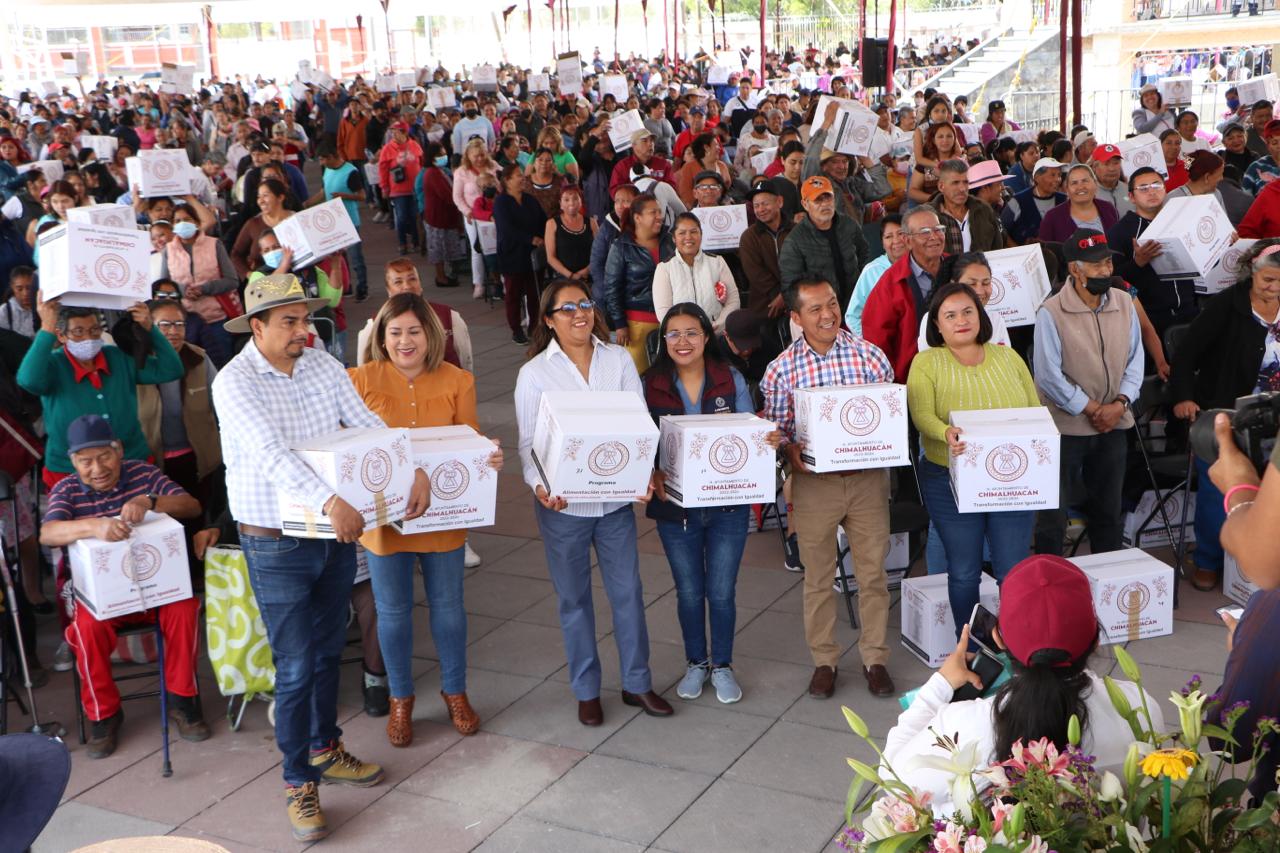 La Presidenta Municipal de Chimalhuacán, Xóchitl Flores Jiménez, entregó 2 mil 755 canastas básicas a familias vulnerables de diversos barrios y colonias en la Plaza Cívica “Benito Juárez”, del barrio Vidrieros, con lo cual concluye esta primera entrega de este año del programa “Alimentación con Igualdad”, que consta de una canasta alimentaria con productos de primera necesidad y se entrega trimestralmente.