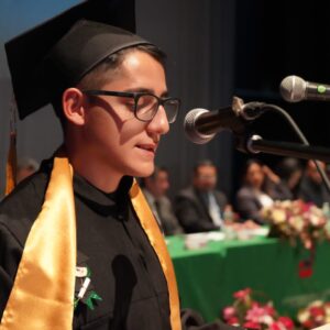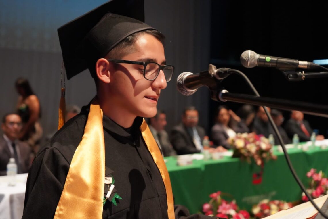 Axel Gil, representante de los alumnos graduados, agradeció a los profesores del plantel, quienes con profesionalismo les brindaron lo mejor de ellos durante su estancia en el Cobaem. También agradeció a las mamás, papás, familiares y amigos de los presentes, quienes desde la infancia los apoyaron con su ejemplo y les enseñaron a respetar a sus semejantes. “Gracias por permitirnos madurar aprendiendo de nuestros traspiés”.
