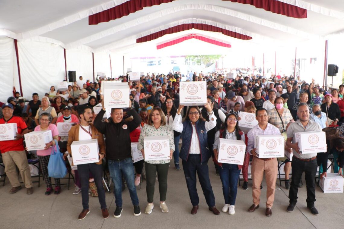Ante miles de vecinos del Ejido de Santa María Chimalhuacán, la Presidenta Municipal, Xóchitl Flores Jiménez, inició la primera entrega del año de canastas básicas del programa municipal “Alimentación con Igualdad”, implementado por primera vez en su administración en el 2022. El objetivo del programa es contribuir a que las familias vulnerables tengan acceso a una alimentación de calidad.